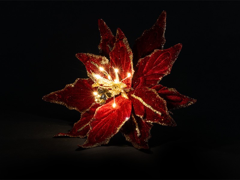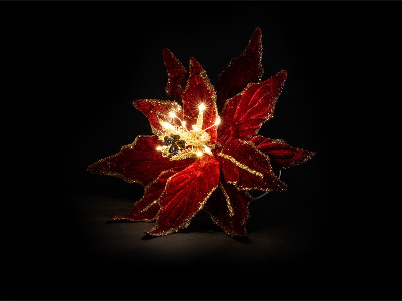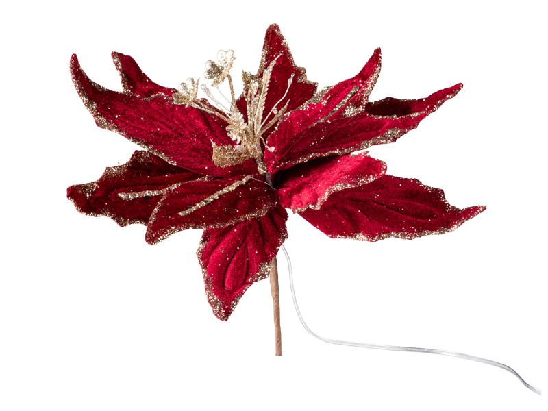 Elegantná látková kvetina v tmavočervenom odtieni s výškou 28,5 cm rozžiari váš interiér jemným svetlom. Vďaka 10 teplým LED diódam vytvorí príjemnú slávnostnú atmosféru bez nutnosti pripojenia k elektrickej sieti. Napájanie na 2× AA batérie (nie sú súčasťou balenia) umožňuje jednoduché umiestnenie kdekoľvek. Jednoduché ovládanie a štýlová kombinácia svetelnej výzdoby s prírodnou eleganciou robia z tejto dekorácie pôsobivý doplnok do vázy.