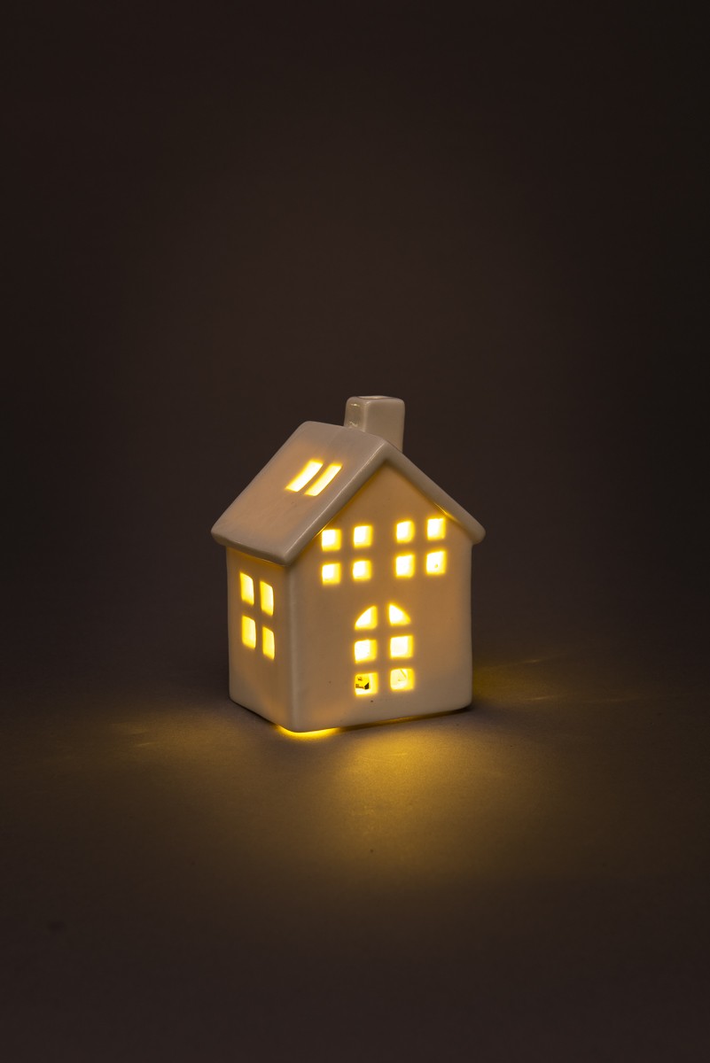 Porcelánový domček s LED žiarovkou a výškou 9 cm. Vďaka otvorom po obvode domčeka dochádza ku krásnym svetelným efektom. Batérie sú súčasťou balenia.