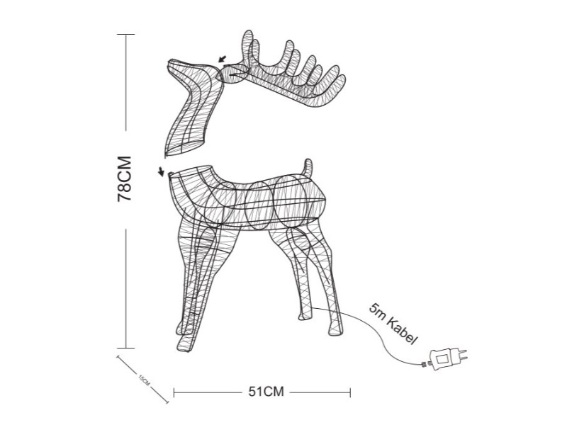 Jeleň je vysoký 78 cm, dlhý 48,5 cm a široký 22 cm. Je vyrobený z pevnej kovovej konštrukcie a zdobený lesklým strieborným plastovým lanom, ktoré odráža svetlo a dodáva mu trblietavý efekt. Celkom 450 jemných LED svetielok v teplej bielej farbe vytvára krásne, mäkké osvetlenie. Svetlá sú typu MICRO LED a sú rovnomerne rozmiestnené po celej postave jelena. Dekorácia je určená na vonkajšie použitie – spĺňa stupeň krytia IP44 a je napájaná bezpečným transformátorom GS, ktorý je súčasťou balenia. Vďaka 5-metrovému prívodnému káblu môžete jelena umiestniť aj vo väčšej vzdialenosti od zásuvky.