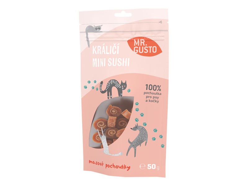 Rozmaznávajte svojho maznáčika delikátnou pochúťkou v štýle sushi. Naša králičie mini sushi je ideálna maškrta pre psov aj mačky, kombinujúca vysoký podiel mäsa s jemnou konzistenciou. Skvele sa hodí ako odmena, malá maškrta alebo spestrenie jedálnička. Hlavnou zložkou je králičie mäso, ktoré je nízkotučné, diétne a vysoko stráviteľné. Vďaka jemnej konzistencii sa dá ľahko rozdeliť na menšie kúsky. Králičie mäso je bohaté na kvalitné bielkoviny a má jemnú chuť, ktorú milujú psy aj mačky. Doplnkové krmivo pre psy a mačky. Perfektná voľba pre jedincov s citlivým trávením, alebo pri diétach s obmedzením tukov.