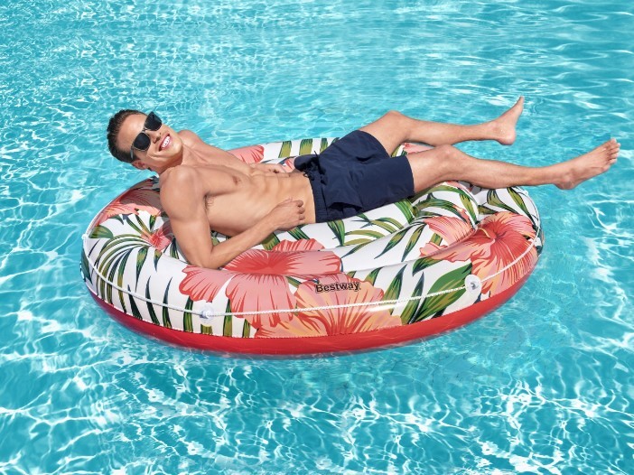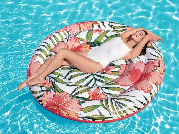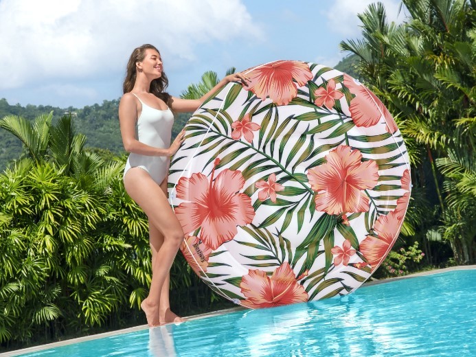 Okrúhle nafukovacie ležadlo s motívom paliem, vám poskytne uvoľňujúci relax na vlnách a na prvý pohľad vás zaujme charakteristickým motívom tropických rastlín. Matrac je vybavený bezpečnostným lanom po celom obvode.