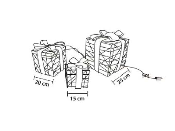 Rozžiarte svoju vonkajšiu výzdobu pomocou tejto darčekovej súpravy LED. Súprava obsahuje 3 krásne darčeky vo veľkostiach 15 cm, 20 cm a 25 cm, všetky s teplým bielym osvetlením LED. Tieto darčeky vyrobené z kvalitného umelého ratanu s elegantným zlatým leskom prinesú vianočnú iskru a radosť do každého vonkajšieho priestoru. Nechajte ich zažiariť a vytvorte nezabudnuteľnú atmosféru počas vianočných sviatkov.